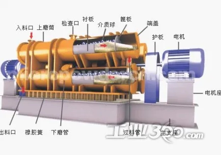 ZM系列振動磨為雙圓筒結構。由電動機通過撓性聯軸器和萬向聯軸器帶動激振器的軸旋轉,激振器的軸上帶有偏心塊,由于帶偏心塊軸的旋轉使雙圓筒做近似的圓振動。筒體內充填研磨介質(鋼球或鋼棒)和待粉磨物料,物料既可從上圓筒的進料口進入,上圓筒內粉磨完畢的物料流入下圓筒繼續粉磨,后從下圓筒的出料口排出,即單進單出;物料也可同時進入上下圓筒進行粉磨,然后同時排出,即雙進雙出或雙進四出。筒體做圓振動時,筒內的介質和物料在筒內翻轉,互相沖擊,這種有規律的翻轉、沖擊和介質的自轉,使物料在短時間內得到粉碎,并達到理想的粉碎效果。